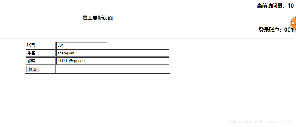%-- Created by IntelliJ IDEA. User: wangy Date: 2018/11/8 Time: 15:27 To change this template use File | Settings | File Templates.--%><%@ page contentType="text/html;charset=UTF-8" language="java" %><html><head> <title>員工更新頁面</title></head><body> <h3 align="right">當前訪問量:<%=application.getAttribute("count")%></h3> <h3 align="center">員工更新頁面</h3> <%--獲取session中的值并顯示到頁面上--%> <h3 align="right">登錄賬戶:<%=session.getAttribute("account")%></h3> <hr> <form action="update-control.jsp"> <table align="center" border="1" width="500px"> <tr> <%--value="<%=request.getParameter("account")%>"可用于實現數據的回顯--%> <td>賬號</td> <td><input type="text" name="account" value="<%=request.getParameter("account")%>"></td> </tr> <tr> <td>姓名</td> <td><input type="text" name="name" value="<%=request.getParameter("name")%>"></td> </tr> <tr> <td>郵箱</td> <td><input type="text" name="email" value="<%=request.getParameter("email")%>"></td> </tr> <tr> <td> <input type="submit" value="修改"> </td> </tr> </table> </form></body></html>