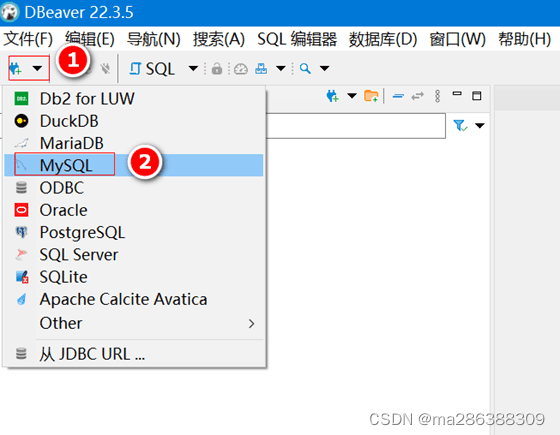 一、DBeaver連接mysql數(shù)據(jù)庫1、 打開Dbeaver后,按下圖操作,點擊圖①的下三角創(chuàng)建數(shù)據(jù)庫連接,然后在選擇②的mysql。