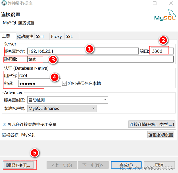 2、按下圖的序號順序填寫ip地址、端口、數(shù)據(jù)庫、用戶和密碼,最后點擊連接測試。