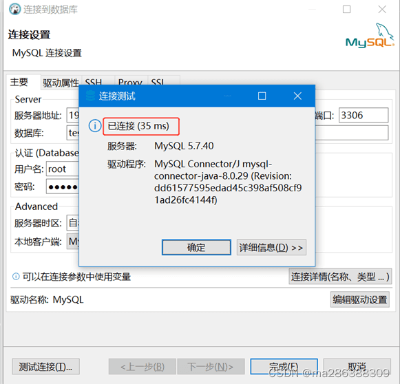 4、下載完驅(qū)動后,再次點擊連接測試,看下圖提示已經(jīng)連接上了mysql數(shù)據(jù)庫。