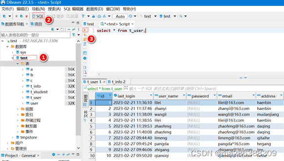5、使用Dbeaver創(chuàng)建查詢窗口。如下圖,①選擇數(shù)據(jù)庫,②點擊創(chuàng)建查詢窗口,③輸入sql后,點擊紅色三角號執(zhí)行sql。
