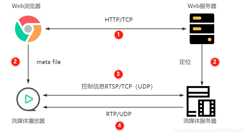③ 流媒體播放器與流媒體服務器運行實時流協(xié)議,交換控制信息,實時流協(xié)議提供執(zhí)行播放,快進、快倒,暫停和錄制等功能。