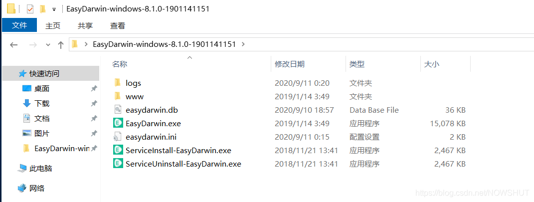 從Github中下載EasyDarwin的Windows端安裝包,打開EasyDarwin安裝文件夾,文件夾中包括下面幾個文件和文件夾: