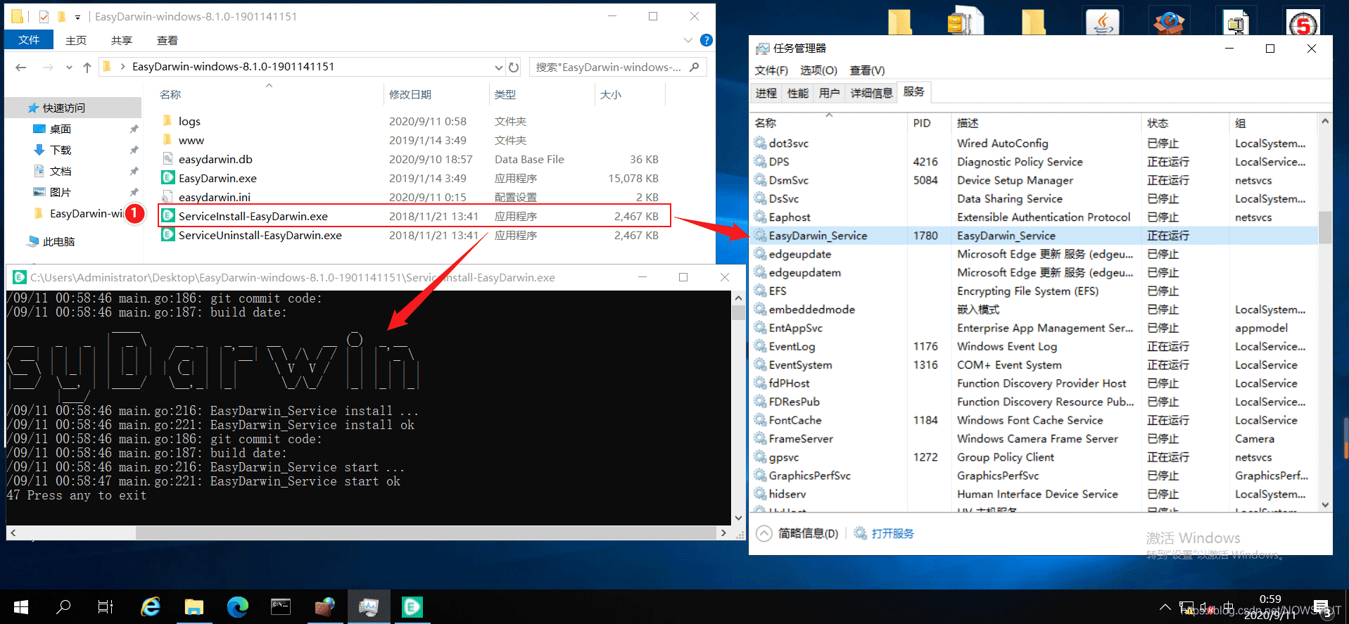 點擊ServiceInstall-EasyDarwin.exe,安裝EasyDarwin服務,出現(xiàn)命令提示符,加載完成后按任意鍵即可,這時EasyDarwin服務已經(jīng)安裝在【服務】中并在后臺運行。