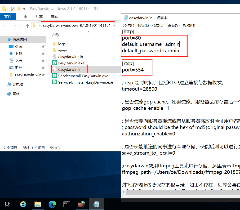 [http]port=80default_username=admindefault_password=admin[rtsp]port=554[http]下的【port】指EasyDarwin的Web控制UI的端口號,默認為10008,根據(jù)實際需求修改,這里改成80。