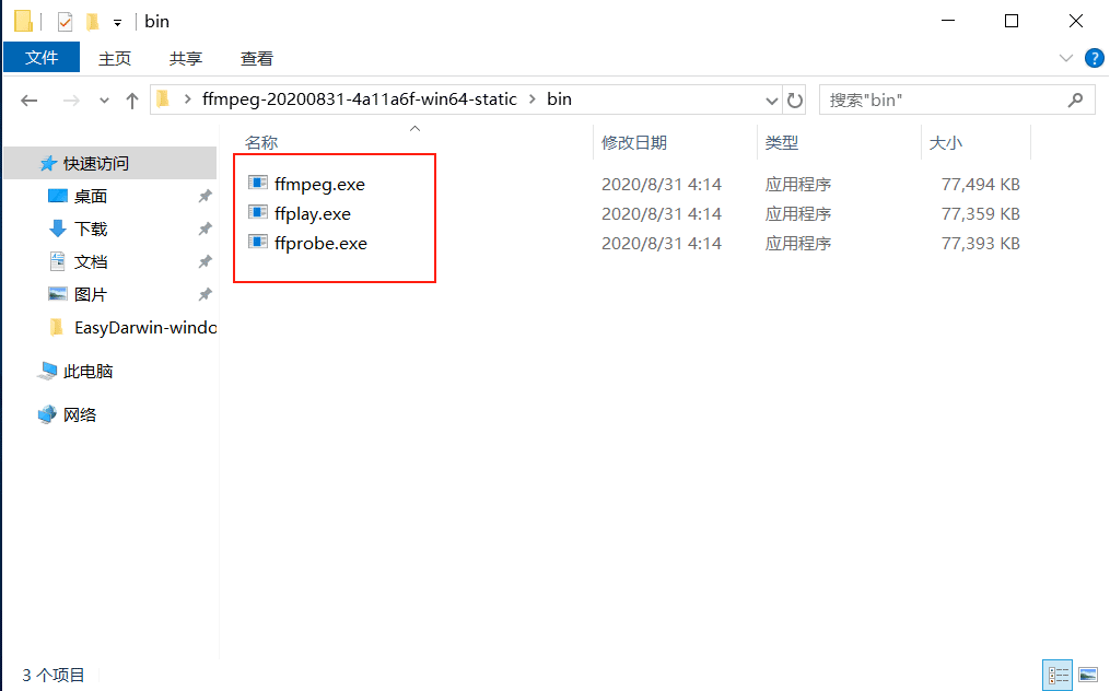 從官網(wǎng)下載:FFmpeg Builds,將文件夾放置相應的目錄中(為設置環(huán)境變量做準備),打開ffmpeg文件夾,點擊bin目錄,看到三個應用程序,其中ffmpeg是用來推流用的。