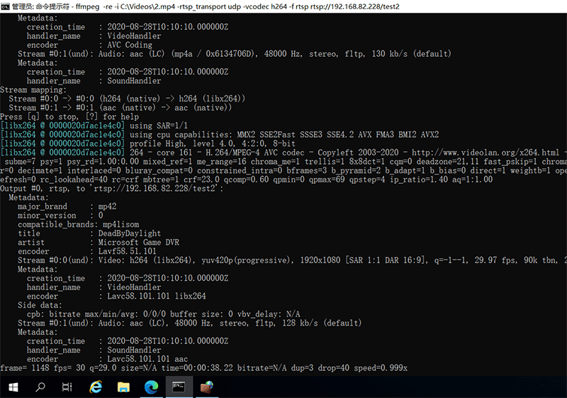 ffmpeg -re -i C:\Videos\1.mp4 -rtsp_transport tcp -vcodec h264 -f rtsp rtsp://192.168.82.228/test# 或者ffmpeg -re -i C:\Videos\2.mp4 -rtsp_transport udp -vcodec h264 -f rtsp rtsp://192.168.82.228/test2