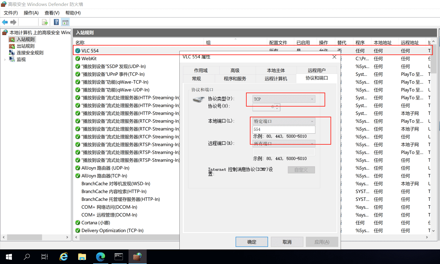 配置一條名為VLC 554的入站策略,選擇特定端口554,TCP連接,允許任何地址連接。