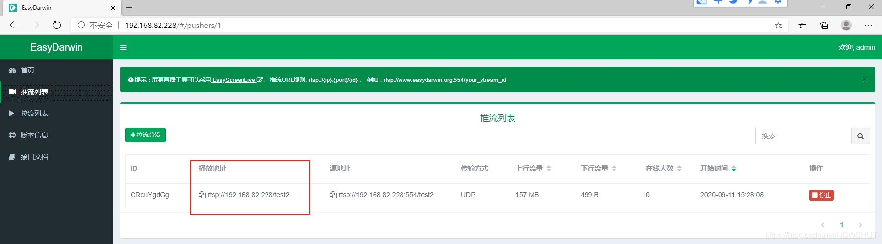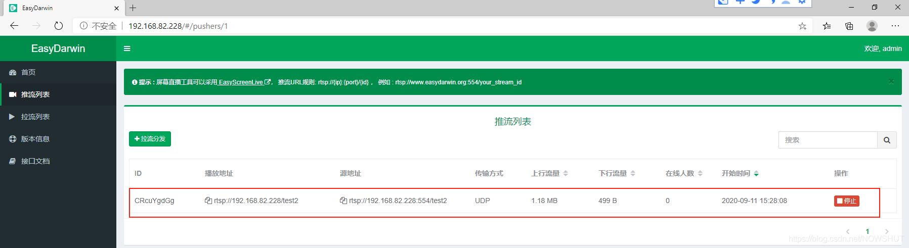 打開瀏覽器,在地址欄輸入:http://192.168.82.228,點擊【推流列表】,可以看到,有一個視頻正在被轉發(fā)(推流)到EasyDarwin服務中。