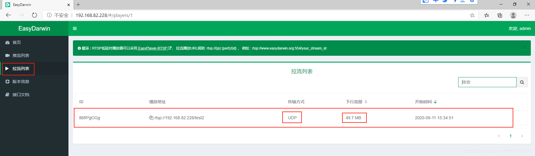 返回流媒體服務器,打開EasyDarwin的Web控制UI,在拉流列表中看到,有客戶端進行視頻觀看,傳輸方式是UDP,下載流量為49.7MB。