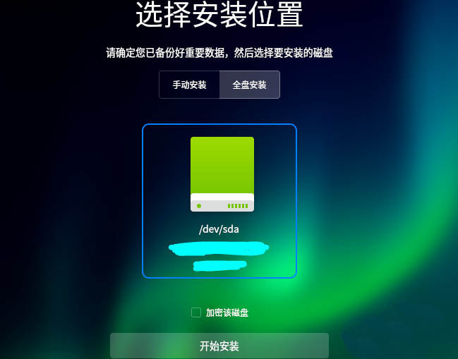 7、選擇安裝位置,此處選擇【全盤安裝】,點擊下面的硬盤圖標,如果需要全盤加密的話,勾選加密選項。然后點擊【開始安裝】。